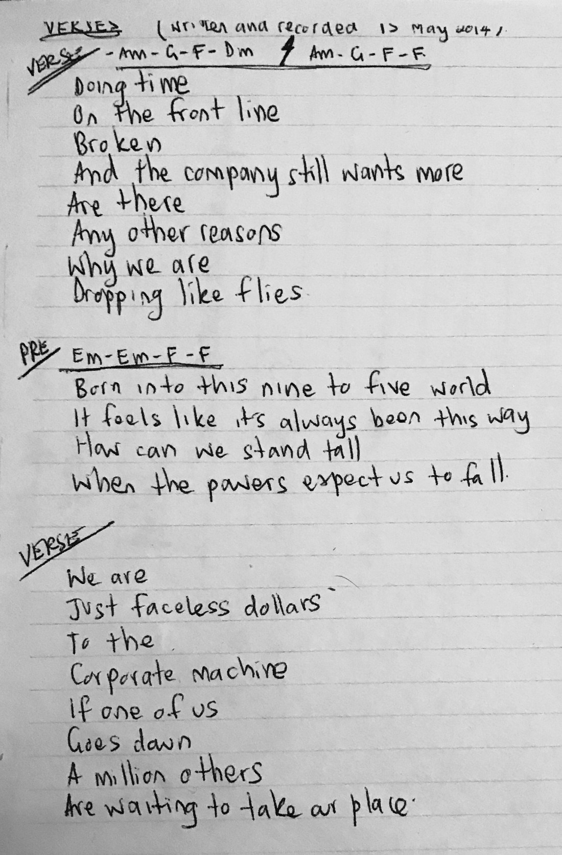 “Born into this nine to five world, it’s always been this way, how can we stand tall when the powers expect us to fall”.