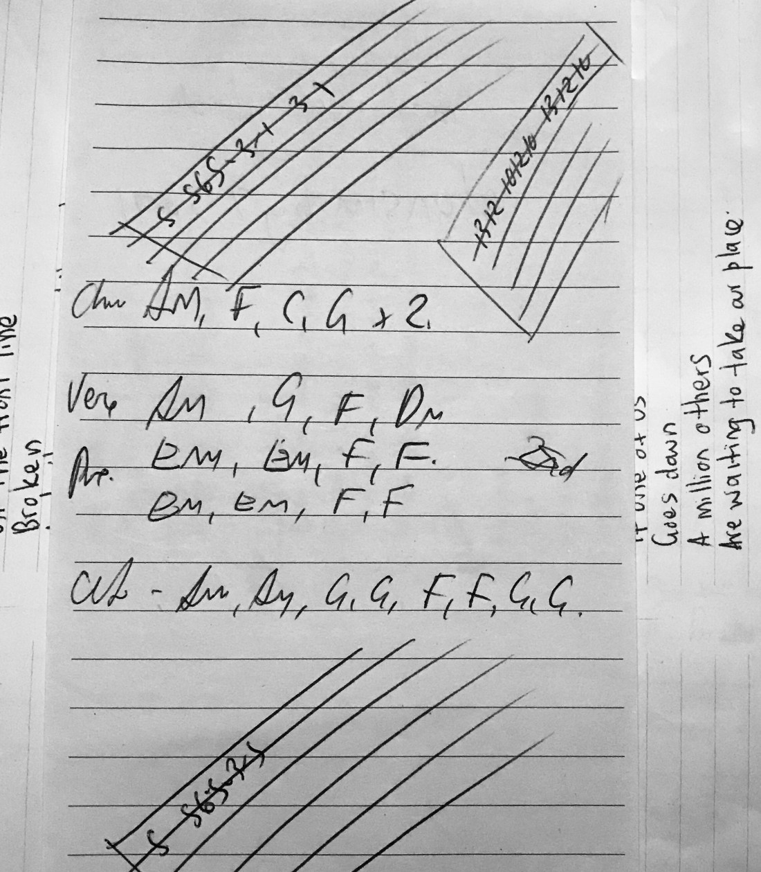 A few days later on September 23, 2013, I recorded a 23 second voice memo of just the chorus vocal melody with no music. A few minutes after that, I recorded a 51 second voice memo of the chorus vocal melody, sung over the chords of Am, F, C and G.