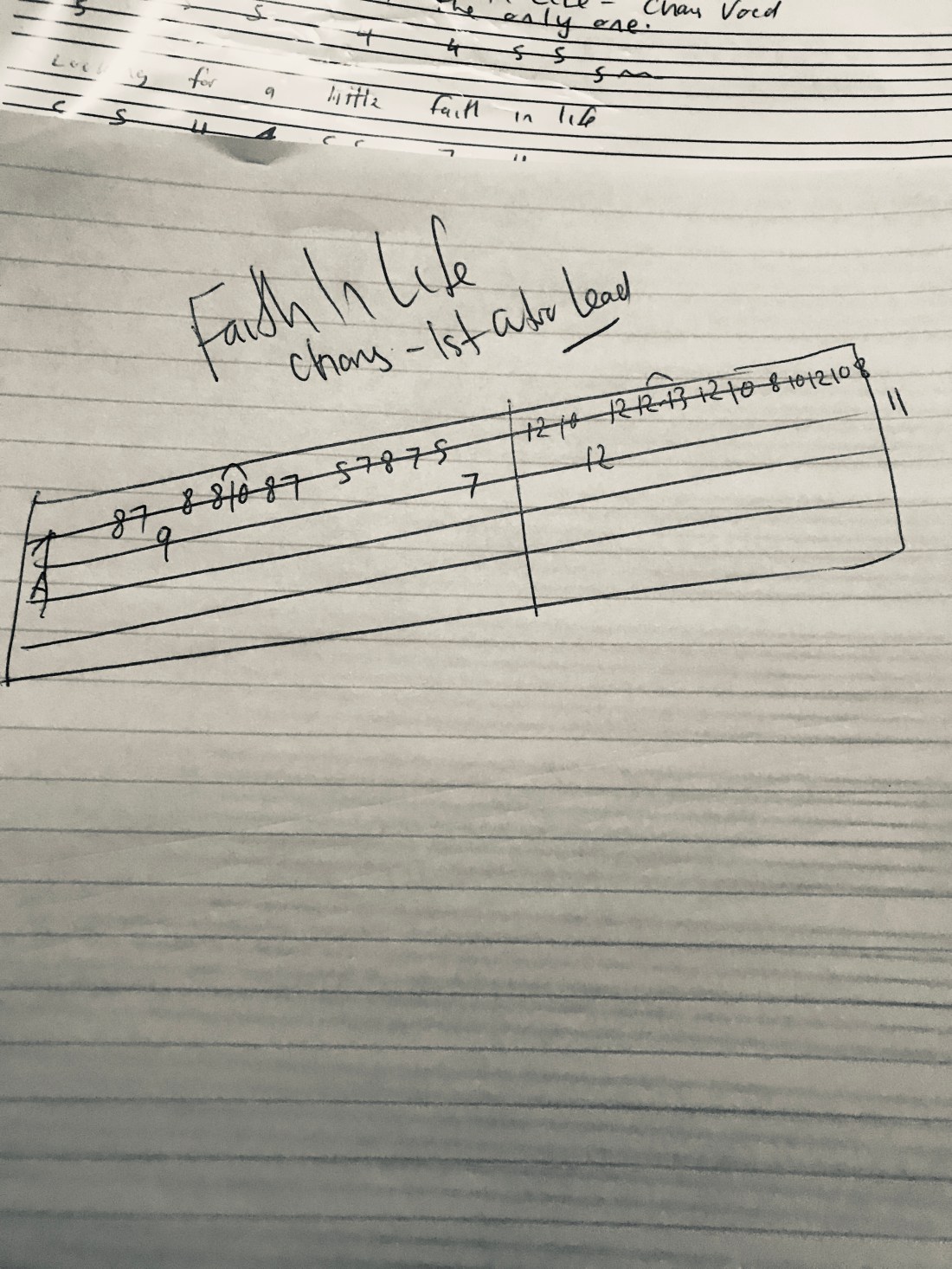 My middle son really liked the Em, C and D chord progression and he just kept on playing those chords around the house. On March 24, 2019, I picked up the acoustic guitar and I started playing some lead breaks and that little melodic lead break you hear before the big outro came about (the photo above). And I recorded it on my music memos. From jamming, some good ideas can be created or fleshed out. But when I was in the studio, I forgot about this lead break.